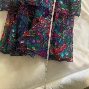This is excellent like new condition. The bottom fabric is layered and the fabric is a multicolored shiny print. There is no fabric tag. Please see measurements.