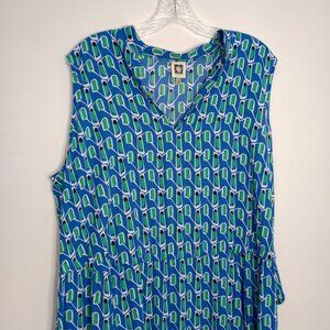 Ann Klein Blue Abstract Print Jenna Drawstring Waist Midi Dress, sleeveless, split V-neck, drawstring waist that ties on the side, pullover style, unlined. Light and flowy polyester fabric. Pretty and feminine dress for spring & summer.