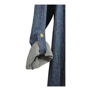 The Ann Klein Chambray Shirt Dress in size 8 is a versatile and stylish piece perfect for various occasions. The dark wash color and collared neckline add sophistication, while the roll tab sleeves and chest pockets provide practicality. Made from a comfortable cotton and elastane blend in a chambray fabric, this short dress is easy to care for with machine washable instructions. The gold logo buttons and exposed zip details add a touch of luxury to this wardrobe essential from Anne Klein.