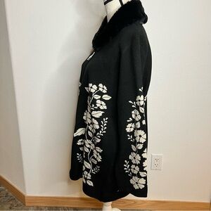 Ann Klein sweater coat is a stylish and elegant choice for women. It features a black color with white floral patterns, a fur collar that can be removed, and a full zip closure for convenience. The long sleeve design and collared neckline add a classic touch to the piece, making it a versatile addition to any wardrobe. Perfect for staying warm and fashionable during the colder seasons, this sweater coat exudes a chic and sophisticated style with a hint of floral charm.