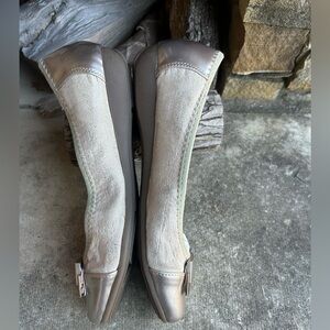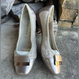 Ann Klein pull in iflex comfortable gold shoe with fabric lining and rubber sole. Pre own in great condition. Sz-8