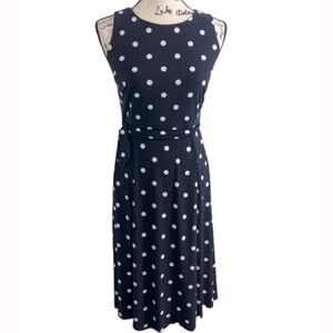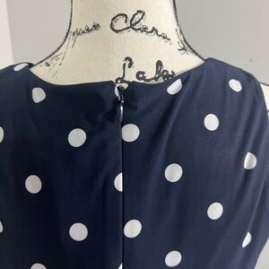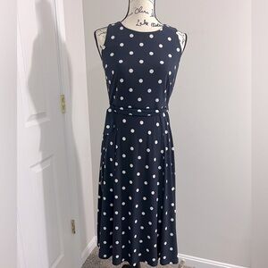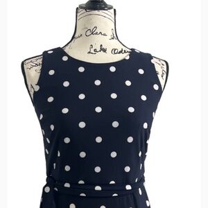 Anne Klein fit and flair knee length midi dress navy blue and white polka dot detachable belt sleeveless flair back zipper scoop neck polyester stretch size large