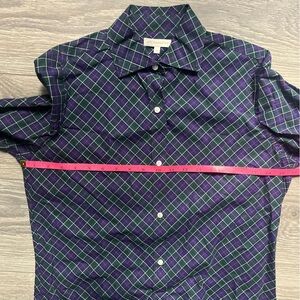 Ann Mashburn button down. Blue and green plaid. Long sleeves. Fitted. Size M. Previously owned.