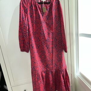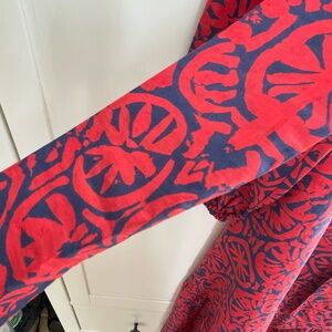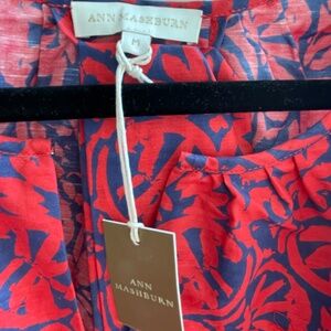 Ann Mashburn Aba dress in blue/red block print. New with tags, never worn, no damage, smoke free home. Has matching detached tie for waist. Note: photo of solid red dress on model is for style only, not color/print.