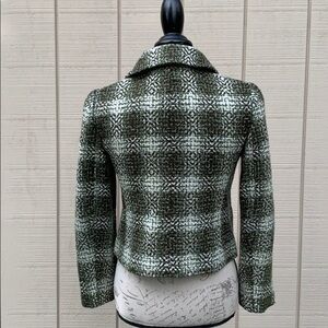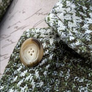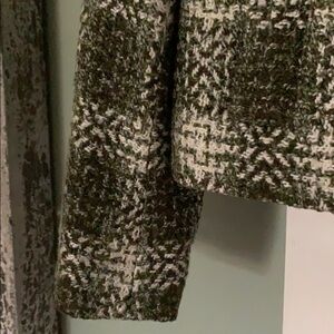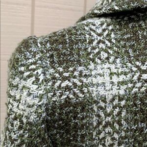 Different shades of green mixed with a beautiful off white for the perfect contrast in this beautiful tweed coat make it the perfect addition to your fall wardrobe. Fully lined. Two button closure. Slit hand pockets. Shell: 62% Acrylic, 34% Polyester, 4% Other Fiber. Lining: 100% Polyester. Dry clean. Measures approximately: 11” armpit to hem, 16” armpit to cuff, 17 1/2” armpit to armpit. 20” shoulder to hem.