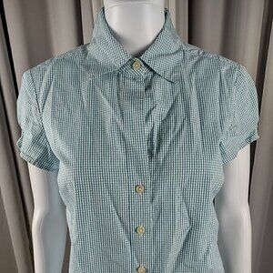 Ann Taylor 100% Cotton Blue White Checkered Short Sleeve Button Down Shirt Sz S