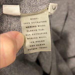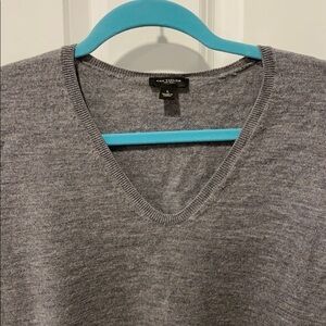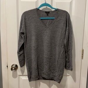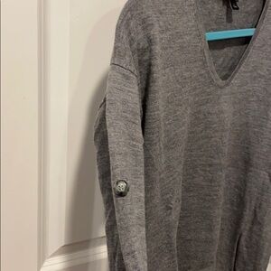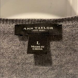Excellent condition from smoke free owner size large and true to size. Gray v neck sweater from Ann Taylor in longer tunic length. 100 % Merino wool, very soft, stretchy, classic sweater. Has buttons on elbows, full length sleeves.