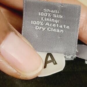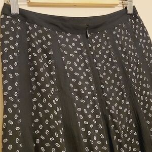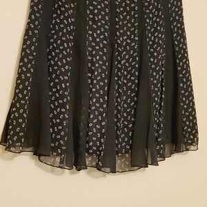 Women's petite, black and white printed, pleated A-line silk skirt, size 4P. Skirt is lined; pleated panels are slightly sheer. Hidden back zipper; skirt slightly longer in the back. Excellent pre-owned condition; no flaws.