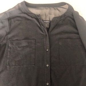 Incredibly comfortable Ann Taylor jersey style blouse. It’s solid black and super soft material on the front and back. It is sheer at the sleeves, shoulder and below the waistline. Button down. Solid black, no fading. Pictures don’t look as nice as it is in person. Can be worn dressy and casual.