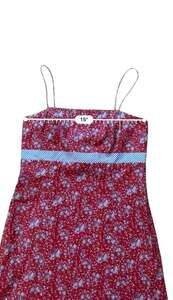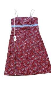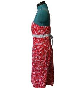 Ann Taylor Red Floral Midi Dress in Women's Size 8. This beautiful midi dress features a vibrant red background with delicate white floral patterns throughout. A distinctive blue and white striped band cinches the waist, tying into a charming bow at the back. Crafted from 100% cotton for both the shell and lining, it offers a comfortable and breathable fit. Perfect for spring outings, casual events, or a stylish summer day. Excellent pre-owned condition with no visible flaws.