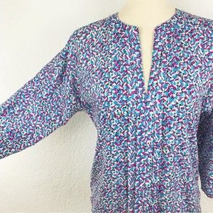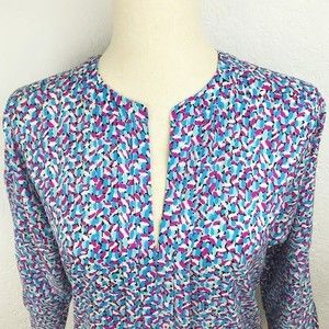 Ann Taylor Abstract Floral Colorful Blouse Jewel Tones Elastic Hem Cuffs V-Neck