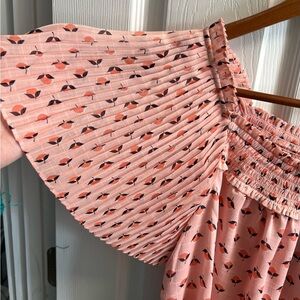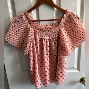 Beautiful peachy, pink colors make this a fun top! This top is really lightweight and flowy. The design is a flower of some kind.