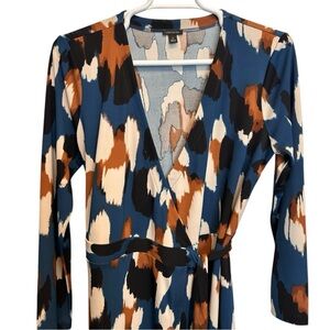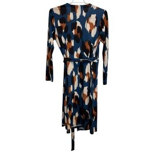 Ann Taylor Animal Print Long Sleeve Belted Wrap Dress, Blue with Black, White & Brown, Women’s Size 14 ~ Great condition