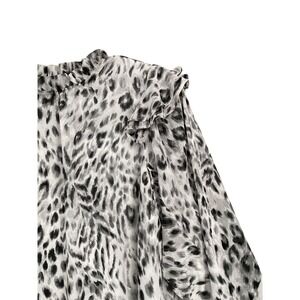 Unleash your inner wild side with this chic Ann Taylor blouse. A captivating animal print in grayscale hues dances across the lightweight fabric, creating a visually stunning piece. The ruffled neckline adds a touch of feminine flair, while the long sleeves with elasticated cuffs offer a comfortable and stylish fit. The relaxed silhouette drapes beautifully, making it a versatile addition to your wardrobe. Picture yourself wearing this blouse to a sophisticated brunch, a stylish office meeting, or a chic evening gathering.
