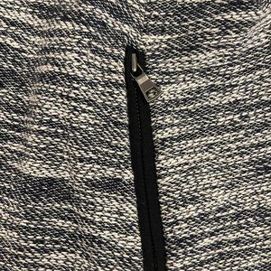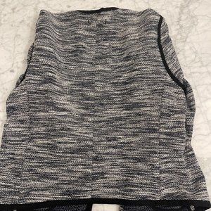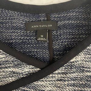 Ann Taylor asymmetrical collarless blazer. Color is navy blue and white with black piping.