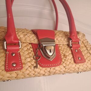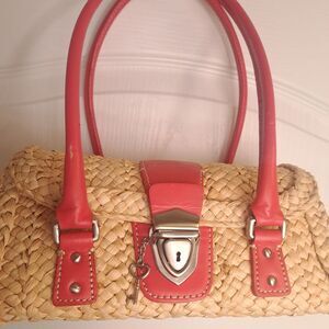 Adorable basket purse with coral pink detail for handle and clasp. Clasp features a key and lock. Lined interior with one pocket. Coral parts have some scratches due to wear.