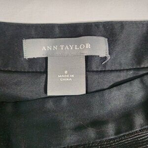 The Ann Taylor Black A-Line Skirt with grid detail is a sophisticated and versatile piece perfect for various occasions. Made from a combination of nylon, rayon, and cotton, this size 8 skirt features a solid black color with a zipper closure for easy wear. The A-line style and short length make it suitable for both formal and casual settings. Ideal for work, social events, or even a party, this skirt exudes a sense of quiet luxury and is a timeless addition to any wardrobe.