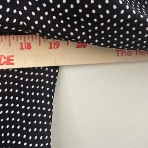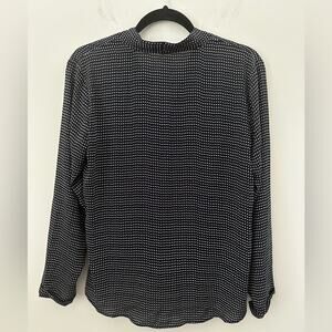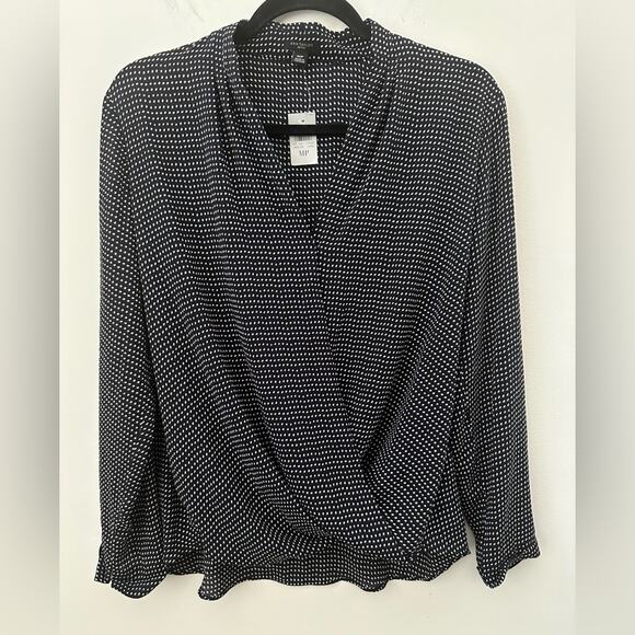 This sophisticated blouse by Ann Taylor features a wrap-style design with a V-neckline and long sleeves. The black and white color scheme is enhanced by a subtle polka dot pattern, creating a timeless look. Crafted from lightweight fabric, it drapes elegantly for a refined appearance.