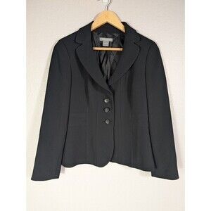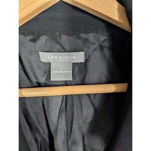Ann Taylor black blazer in size 2. This versatile jacket is suitable for business meetings or evening events. It features a sleek, solid black knit fabric, providing a comfortable and sophisticated fit.
