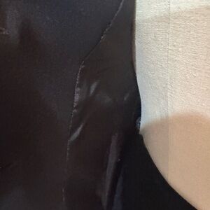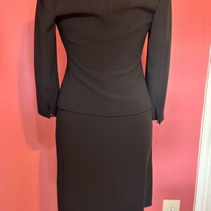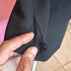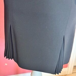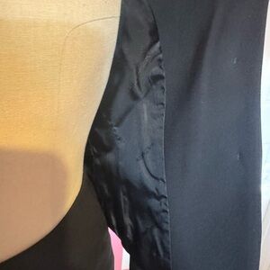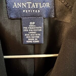 This Ann Taylor blazer features a sophisticated fitted silhouette with structured shoulders and three-quarter length sleeves, making it ideal for professional settings. The deep black color and notched lapels add a touch of elegance to this versatile piece. The blazer has a few spots, so you would have to take this to the cleaner. The skirt is a different size but they do come together. They are a bit stretchy. Fairly used and in great condition! Open to offers