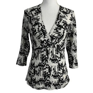 Ann Taylor Black Cream Gray Abstract Striped Blouse Small 3/4 Sleeves V Neck Top