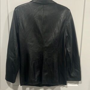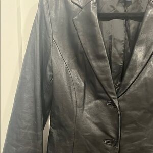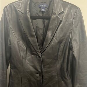 This Ann Taylor black blazer is crafted from high-quality leather, offering a sleek and sophisticated look. Its structured silhouette and notched lapels make it a versatile addition to any wardrobe, perfect for both casual and semi-formal occasions.