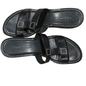 Step into effortless style with Ann Taylor's black leather sandals, featuring wide straps for a secure fit. The decorative white stitching adds a subtle touch of elegance, while the open-toe design ensures breathability. Perfect for casual outings, these sandals offer both comfort and sophistication.