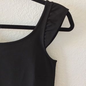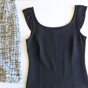 Black knit tank top with ruffle sleeves. Thick knit material has a stiff feeling to it but comfortable. Runs big. Scoop neck. Care tag is cut. Worn once. Very good condition. 24” long. 40% rayon. 24% viscose. 31% polyester. 5% Elastane. Machine washable.