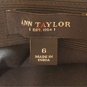 Ann Taylor Black Skirt Size 6. Excellent pre-owned condition. Back hook and zipper closure with elastic at waistband. 52% cotton, 42% rayon and 6% spandex. Dry clean. There is some stretch to the material. Measures approximately waist 30", length 21".