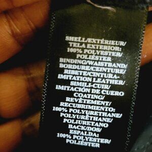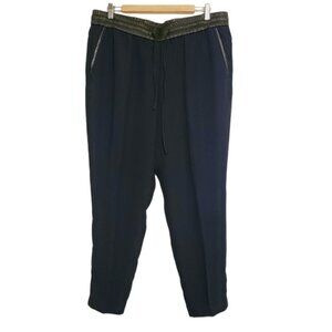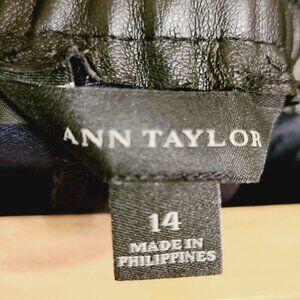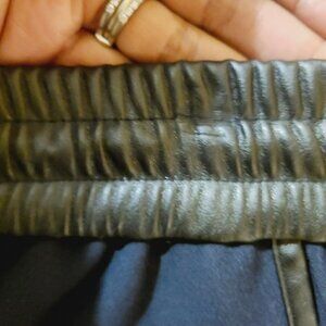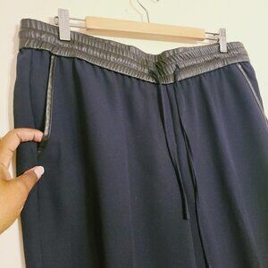 Women's navy blue mixed media skinny pants/slacks by Ann Taylor, size 14. Pants are great to dress up or down. Faux black leather trim on waist and trim on slant pockets. Drawstring ties at waist for adjusting. Short unopened back pockets; please see close-up pictures for more details. Dry clean only. Excellent pre-owned condition; no flaws.