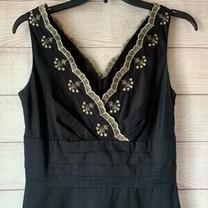 Ann Taylor Black and Gold Embroidery Dress Midi Sleeveless V Neck Size 2