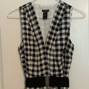 This elegant Ann Taylor dress features a classic black and white checkered pattern, perfect for casual or work settings. The sleeveless design with a plunge neckline and A-line silhouette offers a flattering fit. A solid black belt accentuates the waist, adding a touch of sophistication to this timeless midi dress.