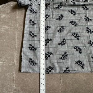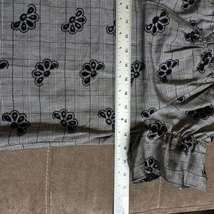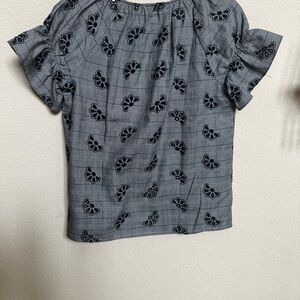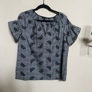 Elegant blouse with floral embroidery. Features ruffled sleeves. Ideal for versatile styling.