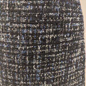 Almost new, rarely worn Ann Taylor Tweed Mini Skirt 00P. Black base with Blue and Beige accents and has subtle little sparkle/sequin accents (hard to see in picts). Nice silk waist accent. Beautiful silk material lining. Also listing matching Blazer in separate listing. Will make a great set. Can wear from work to evening out. Smoke free home.