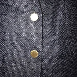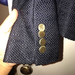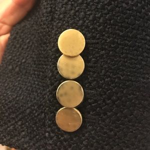 Brand new...never worn. The buttons on the cuffs have some blue on them (shown in picture). The shell is 72% polyester and 28% acrylic. The lining is 100% polyester. The color is close to navy blue.