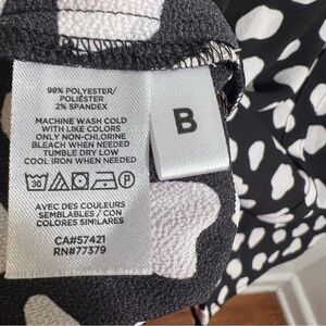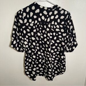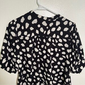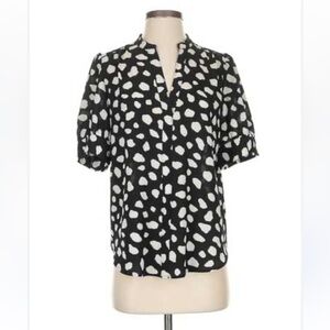 Great condition. Ann Taylor. Blouse. Short, puff sleeves. Split neck. Black with larger white dot pattern. Size small. Stretch 98% polyester, 2% spandex. Pit to pit laying flat 21” shoulder to hem 23” sleeve (shoulder to hem) 11”. All measurements are approximate and taken lying flat. Smoke free home. No trades, offers welcome.