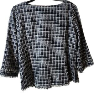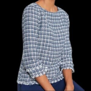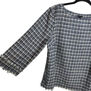 Ann Taylor Blouse Women's 14 Blue Tweed Plaid Fringe Boatneck Pullover Tunic