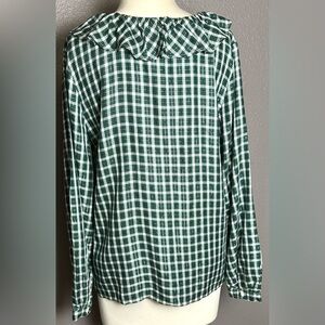 Elegant green checkered blouse with ruffle neckline. Ideal for versatile styling.