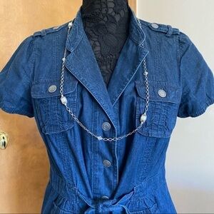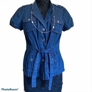 Snap closure front with tie waist and epaulets at shoulders. 2 front pockets and 2 hip pockets, both fully functional with silver studded detail snap closures. Excellent used condition no rips, tears, or stains. Smoke free home.