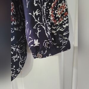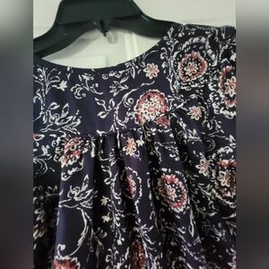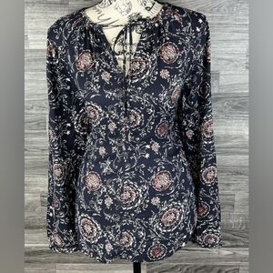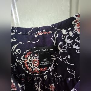 This elegant blouse from Ann Taylor features a romantic paisley and floral print in blue and pink tones. Designed with long sleeves and a stylish tie front, it offers a relaxed and feminine silhouette. The lightweight fabric adds a flowy touch, perfect for a chic and comfortable look.