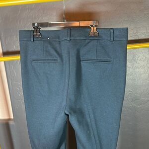 These Ann Taylor trousers feature a deep blue color with a tailored straight-leg design. Made from a smooth synthetic fabric, they have a slight sheen and are full-length, making them perfect for dressy occasions.