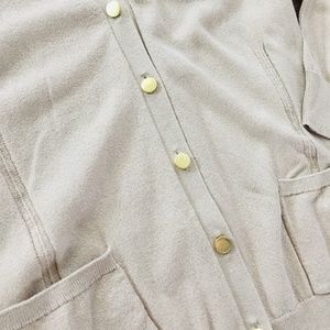 Like new, in fantastic condition. This cardigan is tan with gold button, it is great for the office or date night, the pocket stitching detail & gold buttons make this more than your average cardigan.
