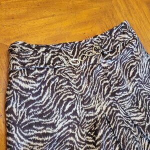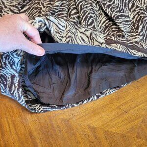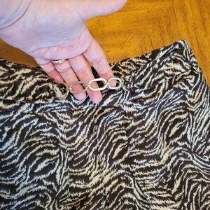 Colors are brown and cream in a wavy pattern. Cotton/wool/silk blend quality fabric; fully lined; high waist; pleated; gold toned chain on front top center for decoration; back center invisible zipper; stylish quality made skirt.