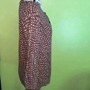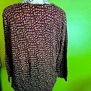 This is pretty purple sweater with green and beige designs. She has three-quarter length sleeves and is light weight. All first are always welcome.