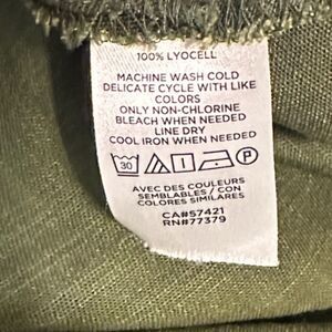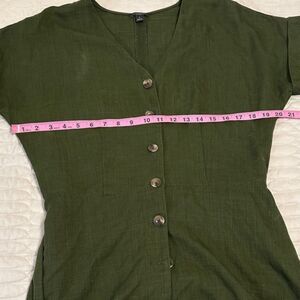 Ann Taylor Button Front Tie Waist Shirt Size M Drop Cuff Short Sleeve Lyocell Business Green Fall Festive Holiday Career Woven Chambray Tortes Shell Buttons V Neck