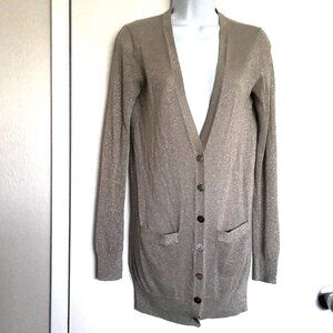 Ann Taylor cardigan sweater, size XS, champagne gold, stretch, oversized, mother of pearl buttons, front pockets, sparkle!