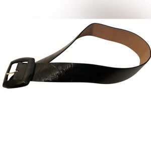 Chic size small patent leather chunky black belt featuring a chunky buckle. The belt is 37.5 inches in length.
