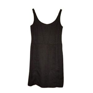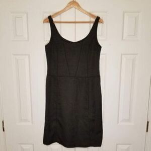 Lovely black sleeveless sheath panel dress in a textured paisley pattern. Scoop neckline. Concealed zipper and hook & eye closure on the side. Fully lined.