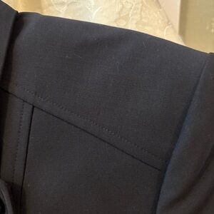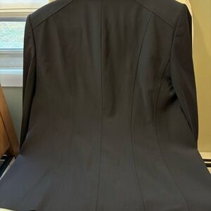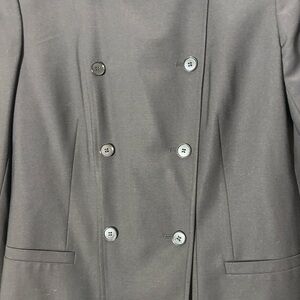 Despite the pictures, this is a true black blazer. It is a classic double breasted, completely lined blazer. It has 8 buttons in the front and 4 small ones on the cuff. There are front and back seams for added definition, two non-functional pockets in the front, a collar and built-in shoulder pads. Fabric content is 85% virgin wool, 10% nylon and 5% Lycra spandex. Measurements are length 38” and pit to pit out 21”. Blazer is in excellent condition.