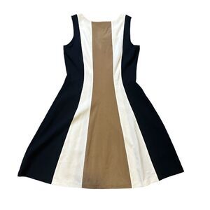 Ann Taylor Colorblock Zipper Front Fit & Flare Style Career Dress. Features chic color blocking in neutral tones of tan/beige, white & black. Sleeveless. Zipper front. Unlined. Measurements in pictures. Approximate length is 35”.